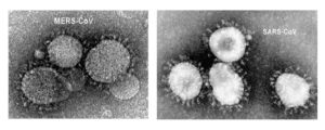 MERS-CoV (Maureen Metcalfe/Cynthia Goldsmith/Azaibi Tamin / Public domain) / SARS-CoV (CDC/Dr. Fred Murphy / Public domain)